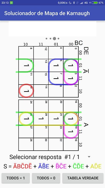 This application solves Karnaugh Map (Kmap) for 2, 3, 4 or 5 variables.