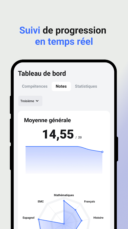 • 14 subjects >> Mathematics, French, History, Geography, ECS, Physics-Chemistry, SVT, English, German, Spanish, SES, Philosophy, Literature, Scientific Education.
