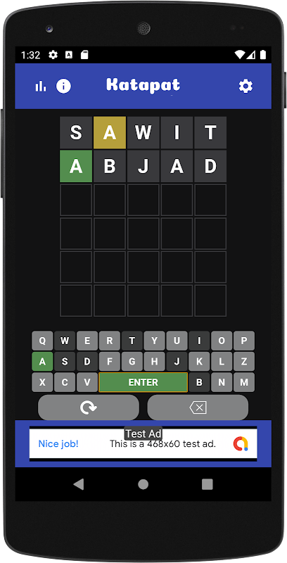 Katapat is Malay Wordle is a word guessing game. This game is inspired from the Wordle style game where a new word is generated globally every 24 hours and you have 5 attempts to guess a 5 letter word, if a certain letter exists in the word and is in the right place it will be green, if the letter exists in word and is in the wrong place it will be yellow and if the letter does not exist in the word then it will be grey.