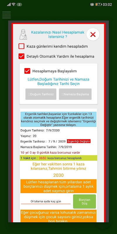 *** The year and age your qada prayers will end is shown.