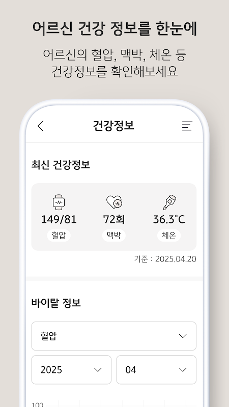 º Check the senior's blood pressure, pulse, body temperature, and other up-to-date health information! You can check how well your senior is doing at the caregiver's facility.