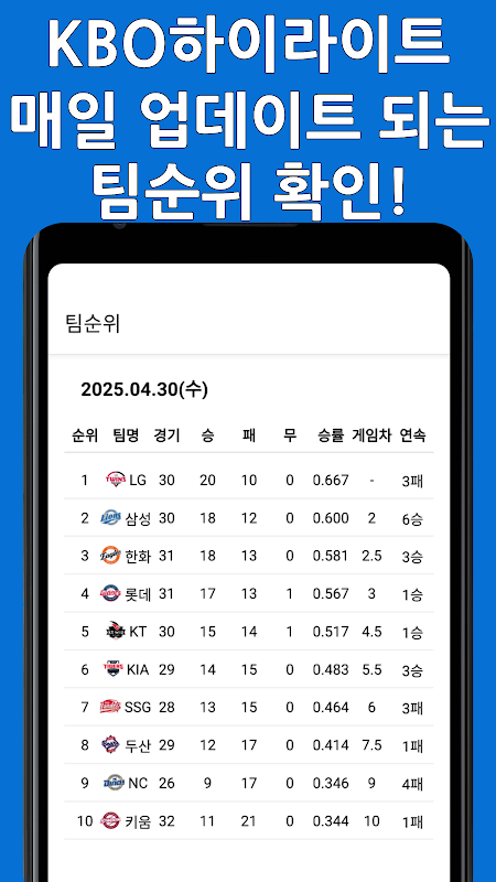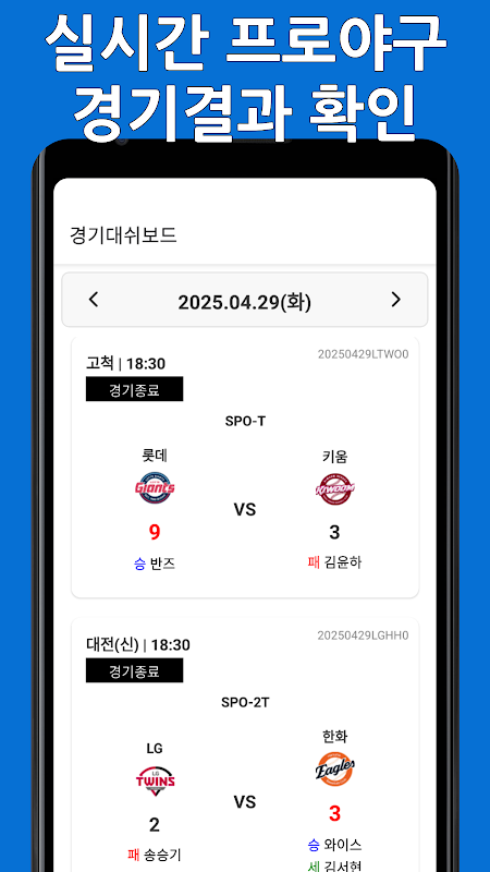 - Real-time match results: All match results from the KBO League are updated in real time.