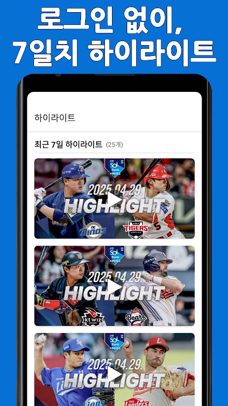 KBO Highlights is the optimal app for KBO league fans. Through this app, you can easily check the latest game results and highlight videos of KBO, the Korean professional baseball league. Users can use the app without logging in or providing any additional personal information, and can check match results in real time and watch highlights of matches they missed at any time.