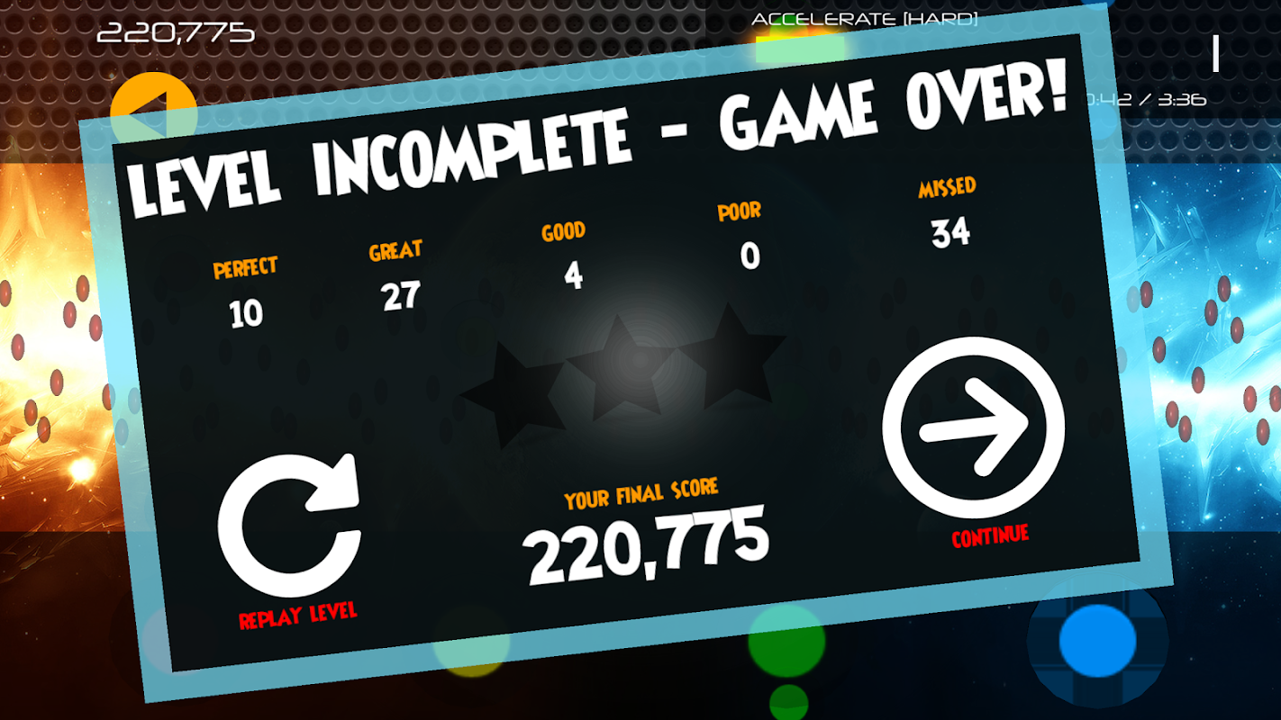 Keep It Straight is a game of visual timing and hand eye coordination. Hit the right notes at the bottom of your screen as they drop from the top. Once the button lights up, press it as quickly as possible. The longer it takes to press the button, the less points you get. Get at least 75% combined accuracy of “Perfect” and “Great” hits to unlock other levels. Keep It Straight is much like the anticipated RockBand genre of games.