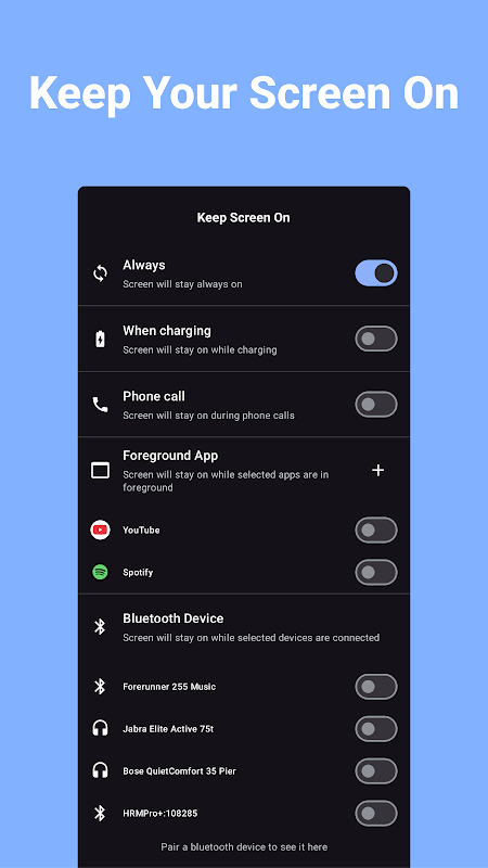 Simply choose when and how you want your screen to stay on. The intuitive design allows you to select specific conditions, such as connected Bluetooth devices, active foreground apps, and more. With PRO features, you can get even more control with app-specific and call-specific screen-on settings.