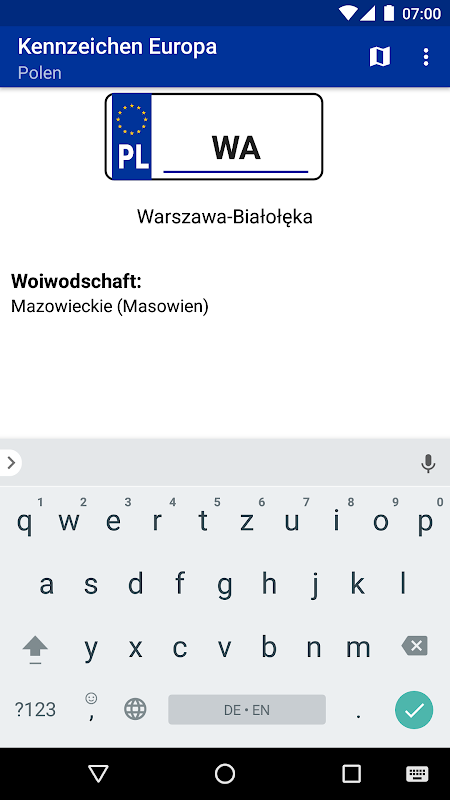 All license plate from Germany, Austria, Switzerland, Bulgaria, Great Britain, Ireland, Croatia, Moldova, Norway, Poland, Romania, Slovakia, Czech Republic and Turkey in an app.