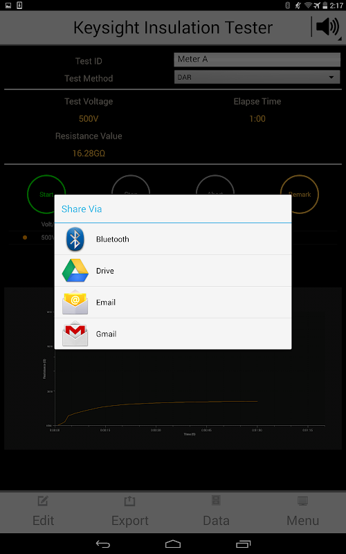 Increase test efficiency and eliminate reporting errors with the Keysight Technologies Insulation Tester app! Now you can fully concentrate on insulation quality of the device under test and get error-free test reports generated in PDF format, for record tracking and sharing purposes. When connected with Keysight U1450A/U1460A Series Insulation Resistance Tester (via the U1177A/U1117A Bluetooth Adapter), Keysight Insulation Tester app allows you to control your insulation resistance test and generate report via Android based devices, wirelessly. Not only it saves time, it eliminates the conventional data entering process and ensures every reading gets recorded accurately at intervals you specify – essential for troubleshooting and preventive maintenance. You can use any of the five insulation testers (U1451A, U1452A, U1452AT, U1453A, and U1461A) with the app.