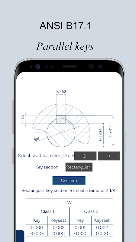 This App provides dimensions for parallel and Gib head keys, keyways and their fits as per the DIN/ISO and the ANSI standards. Whether for design purposes or for shafts and hubs machining, this App is useful to comply with standards.