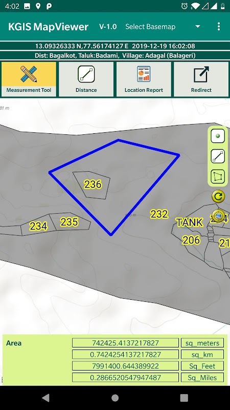 This application is facilitated with Measurement tool, Distance calculation ,Location report which will be redirected to another application. Department will give some value from one application and this application will consume that value and showing the map . In map page if your current location in inside the area then again it redirect to other departmental application.