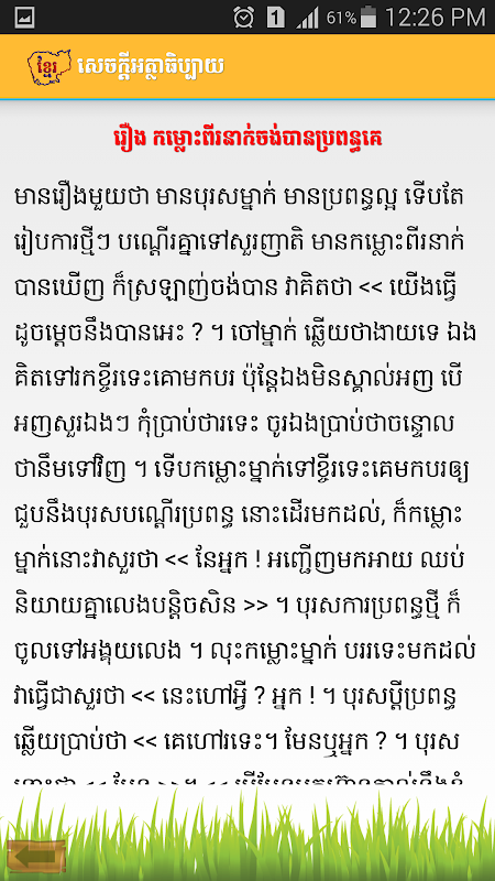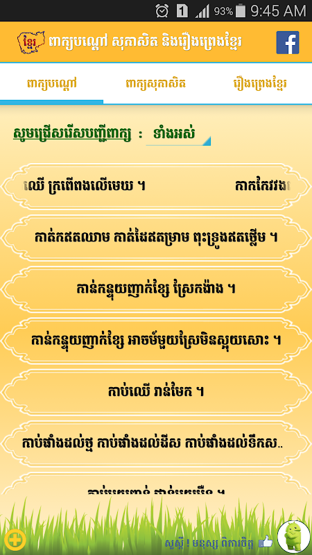 The Khmer Proverbs Application has Khmer Proverb, Khmer Riddles , Khmer History by swipe to any tab in the application. It is useful to us to reading and learning.