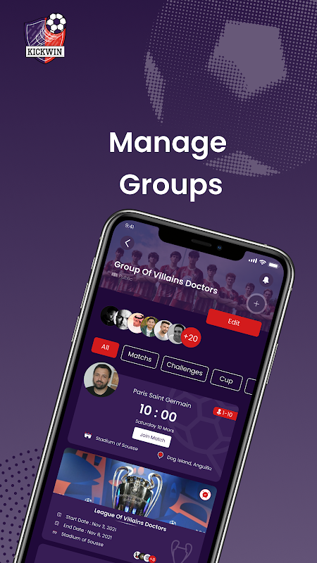 Kickwin is a social platform for organizing football matches and tournaments.