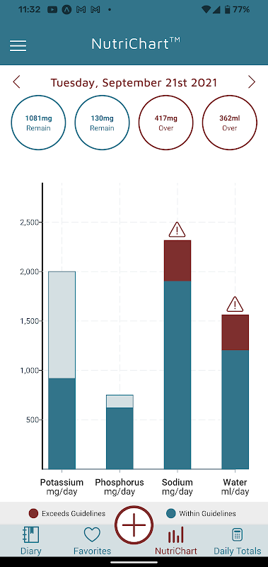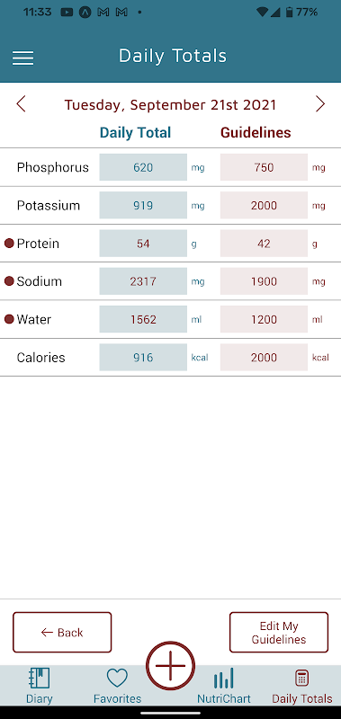 KidneyDiet makes it easy to personalize your Daily Diary Guidelines and compare your nutritional intake against your doctor's recommendations.