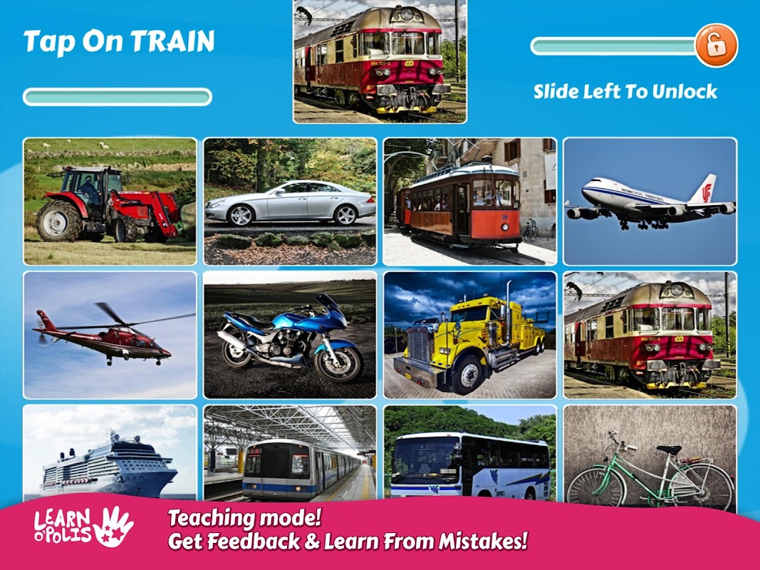 HAVE FUN WHILE LEARNING! Your kids will have have lots of fun while learning the names of different transportation tools: car, bus, train, tram, bicycle, ship, truck, motorcycle, airplane, helicopter, tractor etc. All your child has to do is tap on the vehicle block they see on the screen and listen to the name of the vehicle displayed on that specific block. This method helps memorizing the names of various vehicles and also teaches the right pronunciation.
