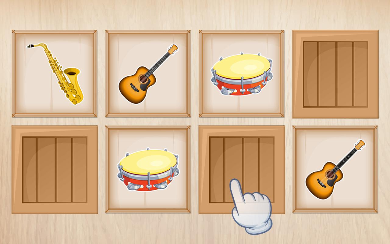 Memory game – A game with increasing difficulty that will challenge your kids, find the pair of musical instruments in a grid of 4, 6, 8 and 12 wooden memory blocks.