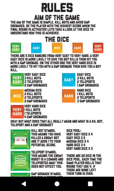 Get ready for the ultimate bot-killing experience! Killer Bots is the dice-rolling game where you must defeat enemy bots while avoiding EMP grenades. With up to 12 players on one device, this game is perfect for groups of friends. Roll the dice and try to get the most bot kills while keeping your EMP hits below 5. With 5 types of dice and 20 in the pool, each with different symbols, the game becomes more challenging as you progress. Activate the last round by reaching 20 bot kills and try to beat your friends' scores. Don't miss out on this must-have game!