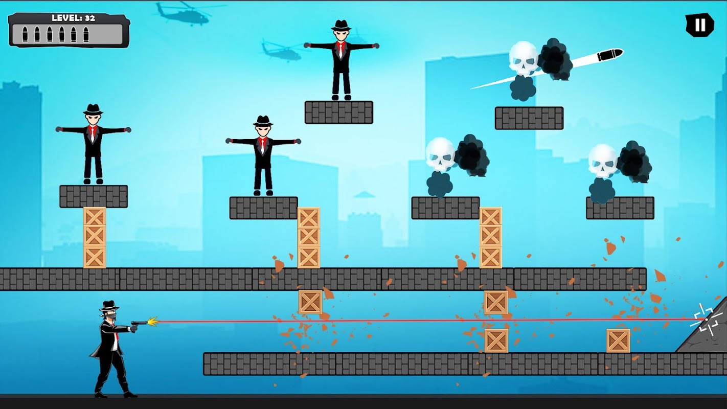 Killer Instinct has 50 levels with interesting obstacles to kill your enemies in multiple ways. Obstacles include shattering glass, breaking wooden boxes, lava fire, TNT bombs and portals to transport your bullet shot. With all these interesting obstacles, killing your enemies makes the game action-packed.