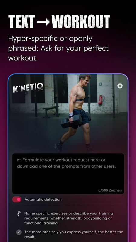 Revolutionize your training with artificial intelligence! Whether you're a beginner or a competitive athlete, whether you have a specific workout in mind or don't know exactly what you want. KiNETIQ, your fitness app for smart training, creates a personalized workout for you based on your wishes and enhances your input scientifically and intelligently.