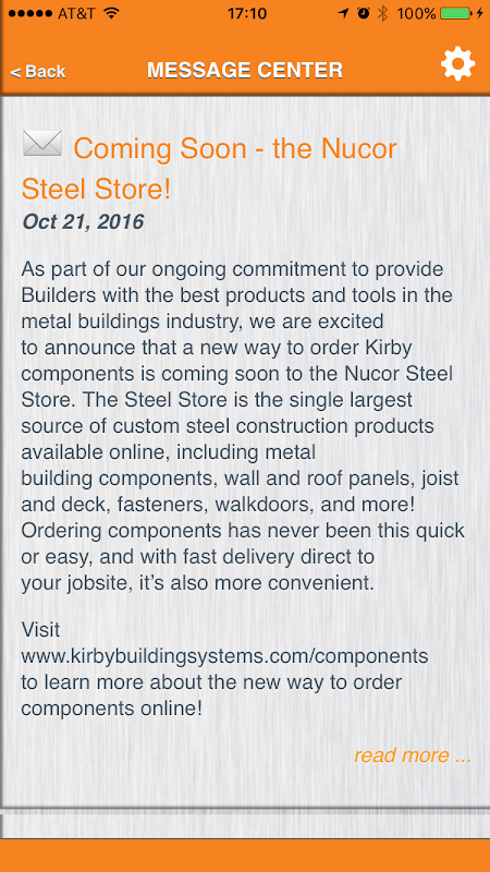The Kirby Building Systems Mobile Toolbox is the all-in-one app for resources and references for your steel building projects. Exclusive to Authorized Kirby Builders, tools such as eQuote and Steel Store are just a click away with the integrated single-sign-on, and you can stay up to date with messages and product bulletins.