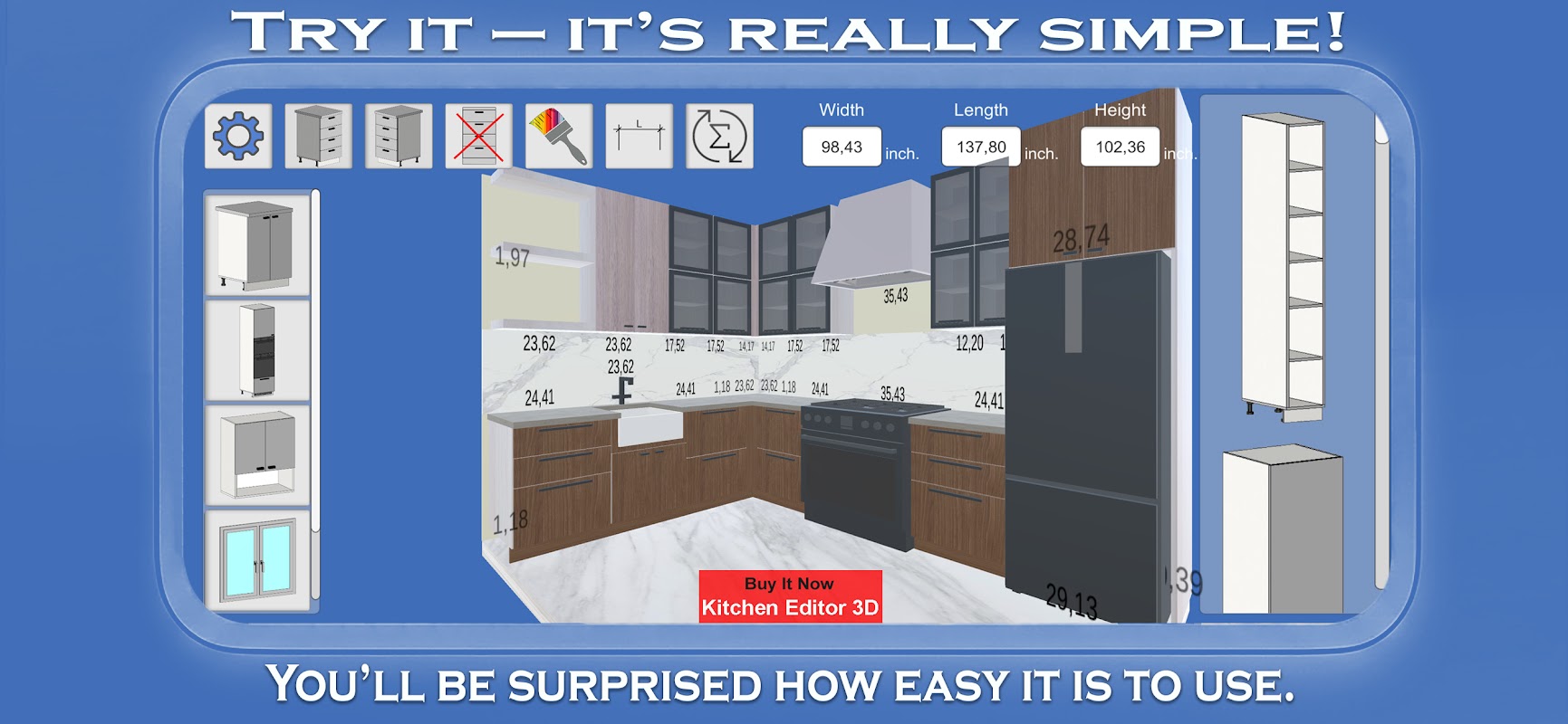 The program has a large set of standard kitchen modules that can be edited according to your needs. Designing the interior of the kitchen has become much easier. A simple scene control algorithm helps to quickly understand the principle of the application. This is not the final version of the kitchen editor. Many new features are planned to be added in the future so that you can visualize your kitchen design idea as accurately as possible. Available measurement systems in the app are millimeters and inches. The program will automatically save your kitchen project before closing, and you can always continue designing after some time. The program is localized in many languages.