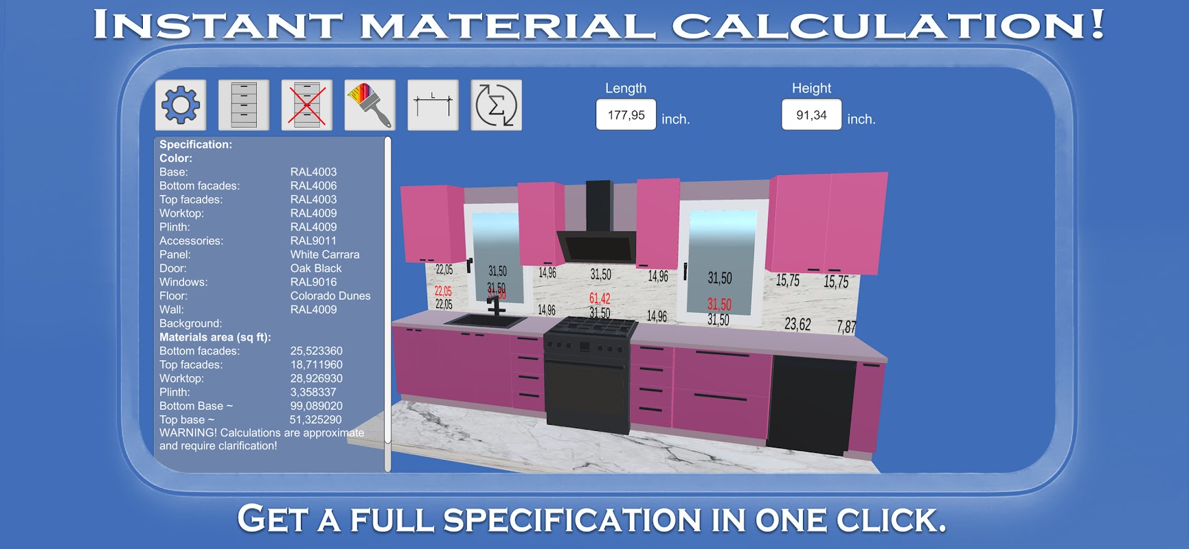 Kitchen Editor Line is the version with the ability to design kitchens of the Linear Type. This is a simple and convenient application for 3D kitchen design, kitchen space, color selection, and counting of materials (RAL, wood, stone).