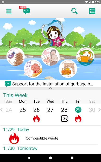 Have you ever had trouble figuring out the right garbage collection days or disposal methods? Kizugawa City’s new Kizugawa City Garbage Sorting App allows you to easily check various details about dealing with garbage—such as collection days, disposal methods, points to note about disposal, a garbage-sorting encyclopedia, and FAQs—that you can use on your smartphone or tablet device.