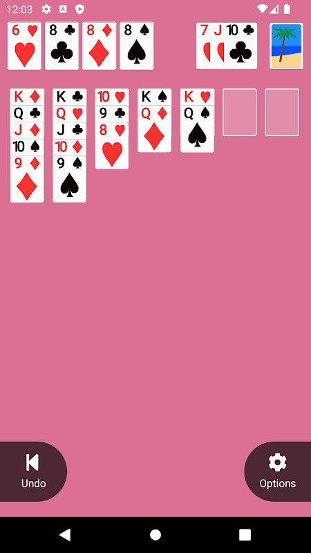Klondike Solitaire, no ads, no frills. Options include play area colour changing, left-handed undo, foundation location customisation, and multiple card designs. Unlimited undo and easy restart allow for fun and relaxing gameplay.
