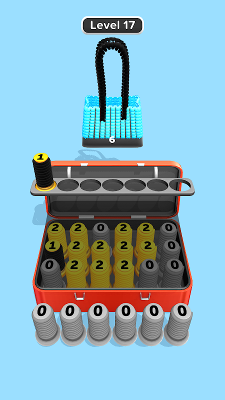 The gameplay is simple yet addictive. Tap the front spool of any row to send it to the merge area. As you align three spools of the same number, they merge into a higher-numbered spool, changing color and pattern in the process.