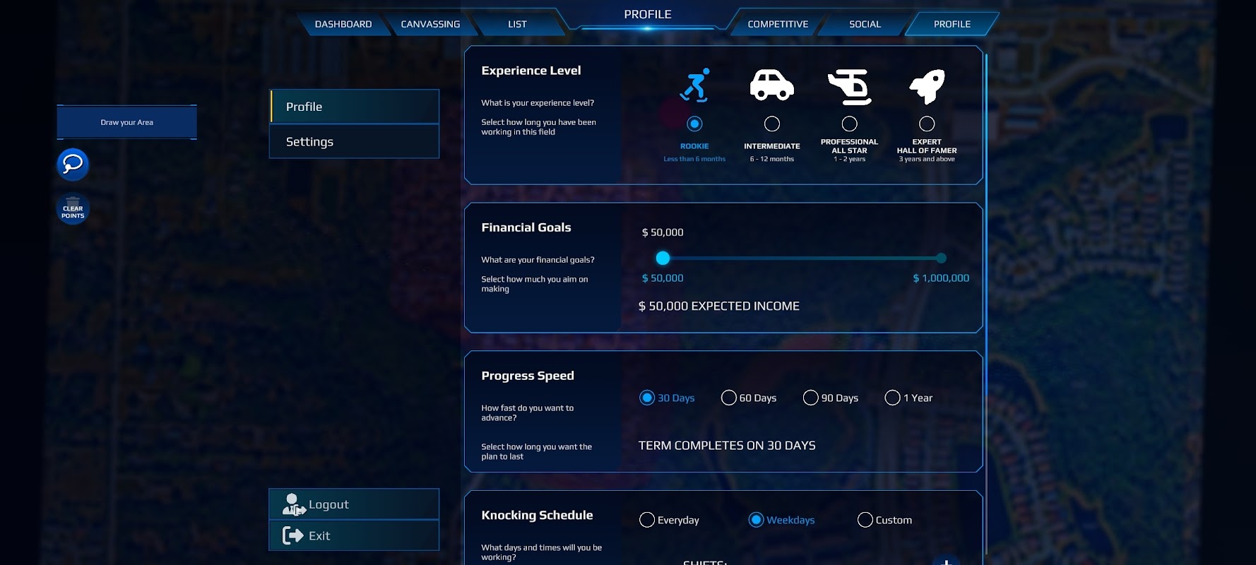 The most advanced D2D software with custom user specific profiles. Configure KPI plans based on experience levels and income targets. Carve areas. Homeowner data, territory assignments. View real time analytics like time in field, activity, tracking (steps, calories, disnance), and pace (doors and appointments per hour)
