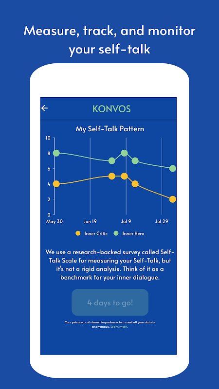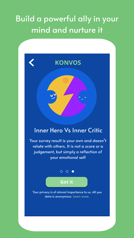 Supported by cognitive science, self-talk research, and narrative psychology, Konvos is your cognitive aid to help you think differently at the moment and change the way you react to emotional situations.