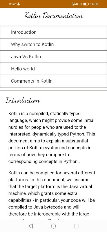 In the "Kotlin Documentation" application, you will learn where Kotlin is used, what are the advantages and differences between Kotlin and Java, which is better for a novice programmer to work with, and much more.