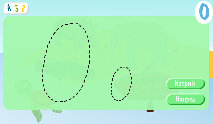 이 프로젝트는 짧은 소개로 시작하여 불가리아 알파벳 30 자와 3 개의 게임 메뉴가 있습니다. 문자가 선택되면, 그것은 특정 문자를 포함하는 요소의 수를 찾아야하는 그림으로 바뀝니다. 편지의 윤곽선을 포함하고 그것을 쓰는 데 사용할 수있는 모듈이 있습니다. 연습 세트의 마지막 부분에는 단어의 올바른 모델에 대해 알려 져야하는 그림이 3 개 있습니다. 게임의 어느 시점에서든 메뉴로 돌아갈 수있는 기회가 있습니다.