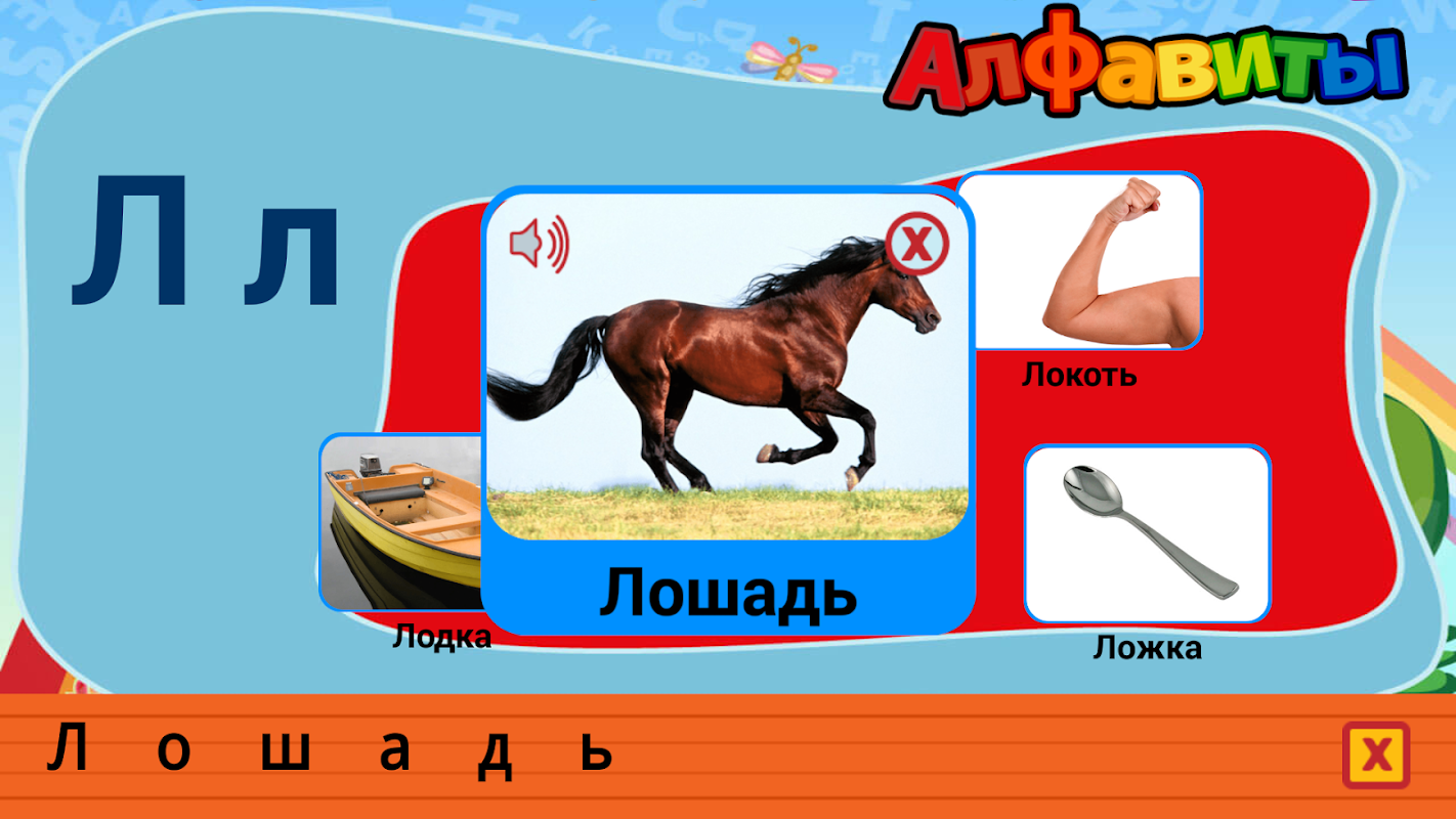 * Несколько слов с каждой буквы с реальной картиной и звуковые эффекты где это применимо.