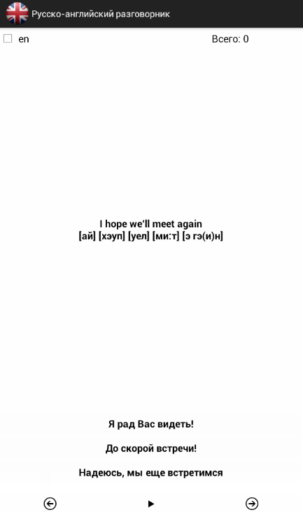 Разговорник содержит 3 теста которые помогут в запоминании слов и фраз. Попробуйте учить английский язык, составляя реальные предложения.Программа предлагает простое выражение на русском языке. Из английских слов на экране нужно составить правильный ответ. Если вы ответили правильно программа похвалит вас, если вдруг ошиблись – подскажет правильный ответ. Мы сделали тренажёр, который доводит до автоматизма умение составлять предложения на английском языке.