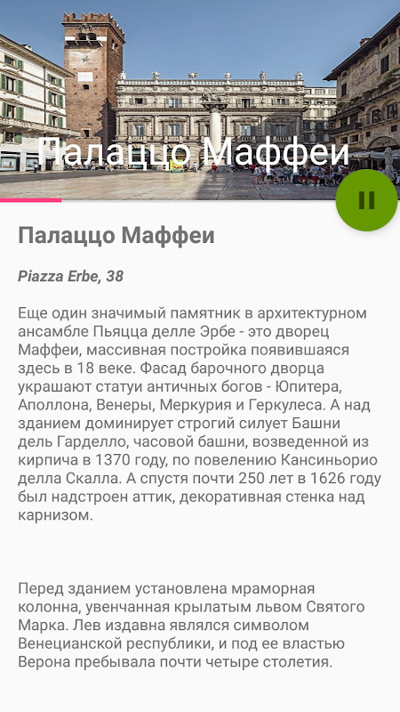 Серия аудиогидов Италия по карману это простые, легкие и удобные путеводители по городам Италии, которые познакомят вас с основными достопримечательностями города за 2-3 часа. Это пешеходные прогулки с аудиосопровождением от профессионального гида и заранее предложенным маршрутом. Экскурсия выстроена таким образом, чтобы провести один день в центре города без использования наземного транспорта. Идеален на один день в городе. Содержит 22 точки маршрута в центре города. Приложение содержит оффлайн карту с поддержкой GPS. Все отмеченные достопримечательности (точки на карте) имеют звуковое и текстовое описание, а также сопровождаются фотографиями.