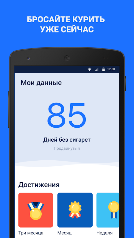 흡연을 중단하기로 결정한 사람들을 위해 특별 카운터 시스템이 신청서에 작성되었습니다. 사용자가 흡연을 중단하기로 결정한 날짜, 하루 흡연 한 담배의 수, 팩의 비용 및 유해 물질의 내용을 입력하면 충분하며 기본 화면에는 항상 저장된 건강 및 돈에 대한 통계가 표시됩니다. 신청서에는 귀하와 귀하의 신체에 대한 귀하의 공로를 상기 시키며, 귀하가 통과 한 모든 단계를 축하 할 수있는 시상식이 준비되어 있습니다. 친구와 소셜 네트워크에서 공유 할 수 있습니다. 귀하를 지원하고 당신의 모범을 보도록하십시오!