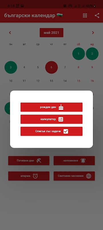 알림을 설정하고 적시에 알림을 받을 수 있습니다. 불가리아 휴일을 상기시키는 것을 잊지 마십시오. 친구와 가족의 생일을 등록하면 미리 알림을 받을 수 있습니다. 계산기, 세계 시계 및 알람과 같은 편리한 유틸리티가 포함되어 있습니다. 세계 시계는 전 세계 여러 도시의 시간을 보여줍니다. 달력에는 매월 발생 이력이 있는 작업 목록이 포함되어 있습니다. 불가리아 현지 시간. 계산자.