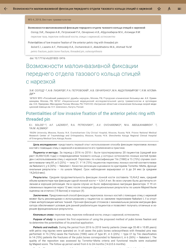 В журнале освещаются актуальные организационные и клинические проблемы современной травматологии и ортопедии, такие как множественные и сочетанные (в том числе и огнестрельные) повреждения опорно-двигательного аппарата, патология суставов, позвоночника, метаболические остеопатии, системные заболевания скелета, опухоли и опухолеподобные процессы. Публикуются результаты экспериментальных патофизиологических, морфологических и биомеханических исследований в травматологии и ортопедии, а также методики фармакологический коррекции, анестезиологического пособия и реабилитации при заболеваниях и повреждениях органов движения и опоры. Входит в перечень ВАК. Представлен в базах данных РИНЦ, Ulrich's Periodicals Directory, Google Scholar.