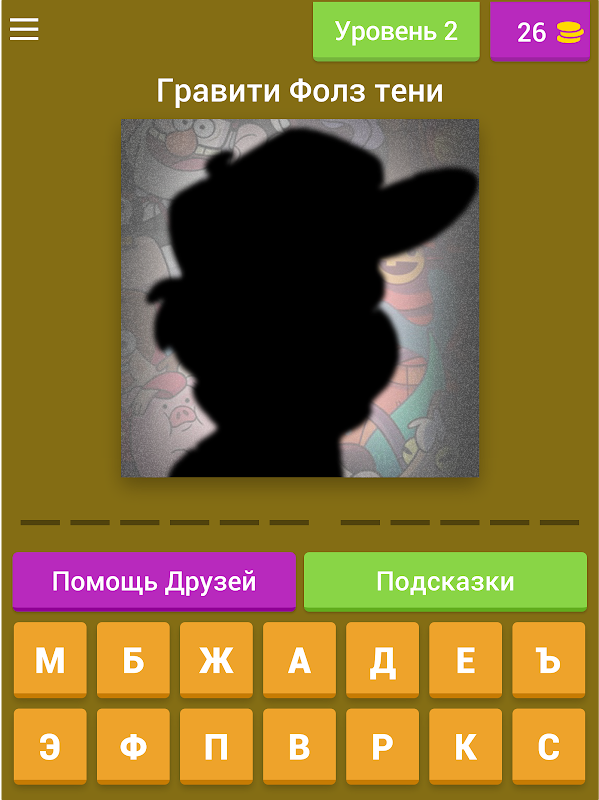 Игра для фанатов мульта Гравити Фолз. Попробуйте разгадать всех персонажей! Это не скучная викторина в которой тебе нужно будет угадывать персонажей из любимого мультсериала. Если ты вдруг не можешь угадать, то тебе на помощь придет подсказка!
