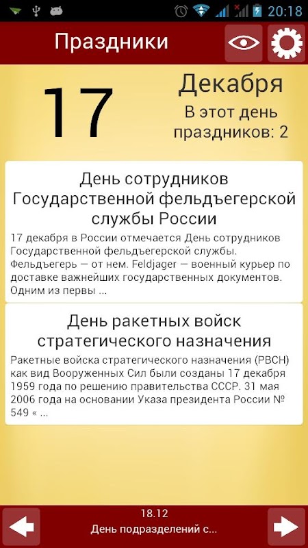 В этом приложении хранятся все известные и неизвестные праздники России. Каждый день вы можете посмотреть какой сейчас праздник, и узнать историю этого праздника. В приложении хранятся справочники, которые вы можете включать или выключать, те которые вы не хотите использовать.