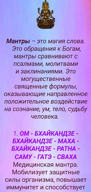 진언을 읽고 노래하는 것도 긍정적 인 사고의 힘을 얻고 부정적인 것을 정화하는 데 도움이 될 것입니다. 강력한 진언이 자신과 함께 일하는 데 도움이됩니다. 건강의 만트라, 사랑의 만트라, 돈과 부의 만트라, 부정으로부터의 정화와 치유의 만트라, 만트라-권력의 만트라, 욕망을 충족시키기위한 만트라. 다양한 만트라가 텍스트 형식으로 기록되므로 하루 중 만트라를 선택하고 연습을 시작하면됩니다-온라인 만트라를 읽으십시오. 일정 시간이 지나면 진언으로 부정적인 치유가 어떻게 진행되는지 알 수 있으며 정화의 에너지를 느낄 것입니다.