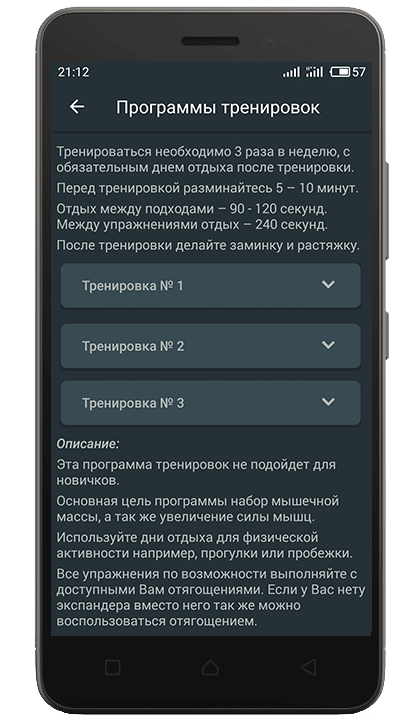 В разделе который называется – упражнения, большой выбор упражнений для тренировок дома, которые дадут Вам возможность проработать все группы мышц дома не используя тренажеры, гантели. В приложении достаточное количество упражнений для домашних тренировок, которые не требуют никакого оборудования. Что бы выполнять эти упражнения в домашних условиях можно использовать доступные Вам отягощения.