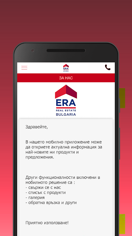 „Основана през 1971 г., ERA Real Estate е световен франчайз лидер в областта на жилищните имоти с близо 45-годишен опит в разработването на продукти и услуги, ориентирани към клиентите. Мрежата на ERA включва около 33 000 консултанта и приблизително 2 300 офиси в САЩ и 34 страни по света. ЕРА Европа е представена в 13 държави с над 1100 офиса и над 6 000 консултанта. В България ЕРА присъства от 2006-та година и има 22 офиса в градовете София, Варна, Бургас, Поморие и Благоевград.“
