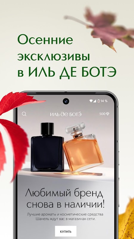 첫 구매 시, 프로모션 코드 SMILE을 사용하시면 8,000루블 이상 구매 시 1,000루블 할인 혜택을 드립니다. ILE DE BEAUTE와 함께 뷰티의 세계를 경험하세요! ILE DE BEAUTE 모바일 앱에 처음 가입하시면 모든 향수와 화장품에 500루블의 보너스가 지급됩니다.