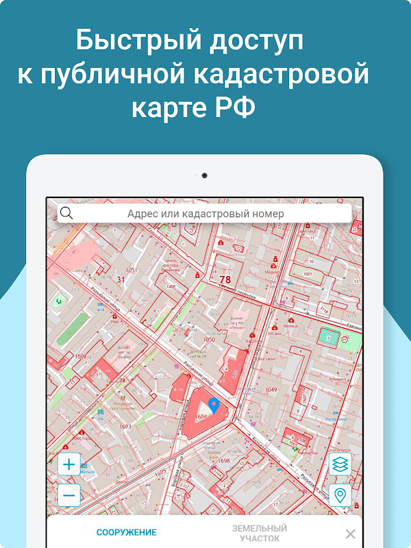 응용 프로그램 "지적 - 러시아 연방 지적도" - 러시아의 모든 부동산에 대한 부동산 등록부의 공개 지적 정보에 액세스할 수 있습니다. 출처: 러시아와 Rosreestr의 공개 지적도.