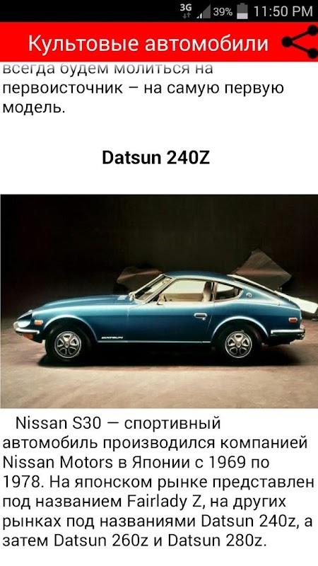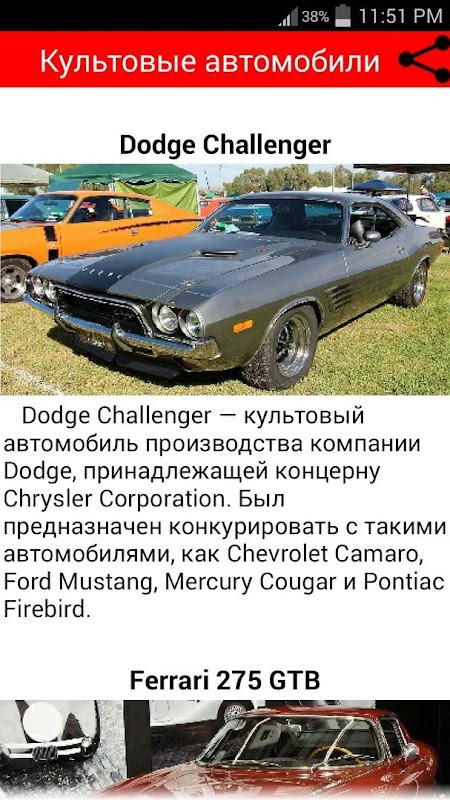 В приложении " Коллекция культовых автомобилей " собраны самые красивые, стильные и культовые машины всех времен и народов.