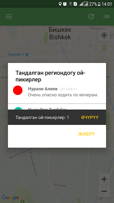 Адамдар бул тиркемени көчөдөгү тартип бузуулар тууралуу маалымдоо үчүн пайдалана алышат.