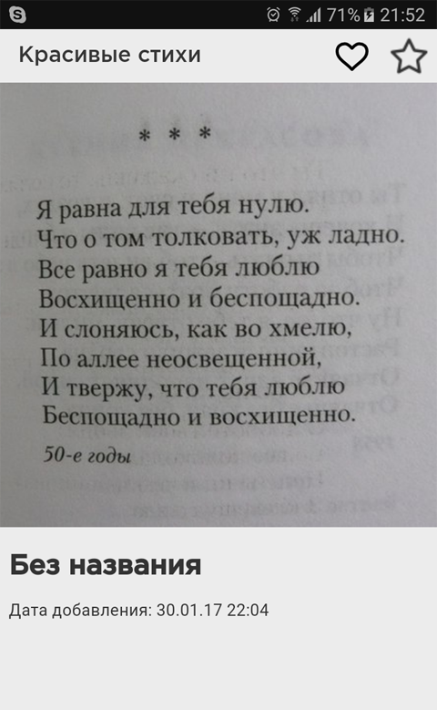 В приложение «Красивые стихи» вы найдете множество уникальных авторских текстов (стихи и проза), которые можно подарить близким и любимым людям. Имеются высказывания на все случаи жизни: романтические, любовные, тематические, именные. Приложение регулярно пополняется новыми тестами, которые помогут вам оригинально признаться в любви, сказать как сильно вы скучаете в разлуке с любимым человеком, пожелать ему доброго утра, хорошего дня или приятных снов.