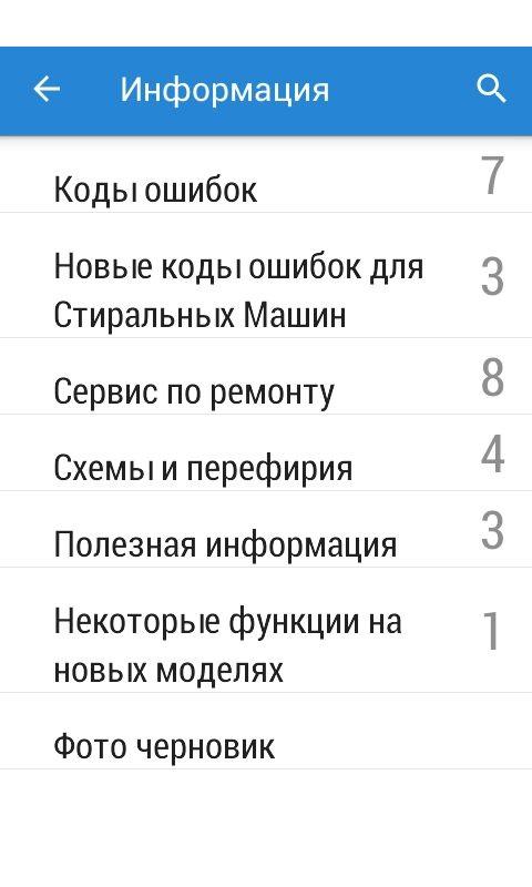 В этом приложении Вы найдете полезную для себя информацию - это в основном коды ошибок для стиральных машин, холодильников, кондиционеров, водонагревателей и для другой бытовой техники.Особенно полезна будет программа для начинающих мастеров по ремонту Стиральных Машин. Новая информация всегда дополняется в зависимости от запросов мастеров. Желаю удобных Вам ремонтов с приложением "Мастер95"!