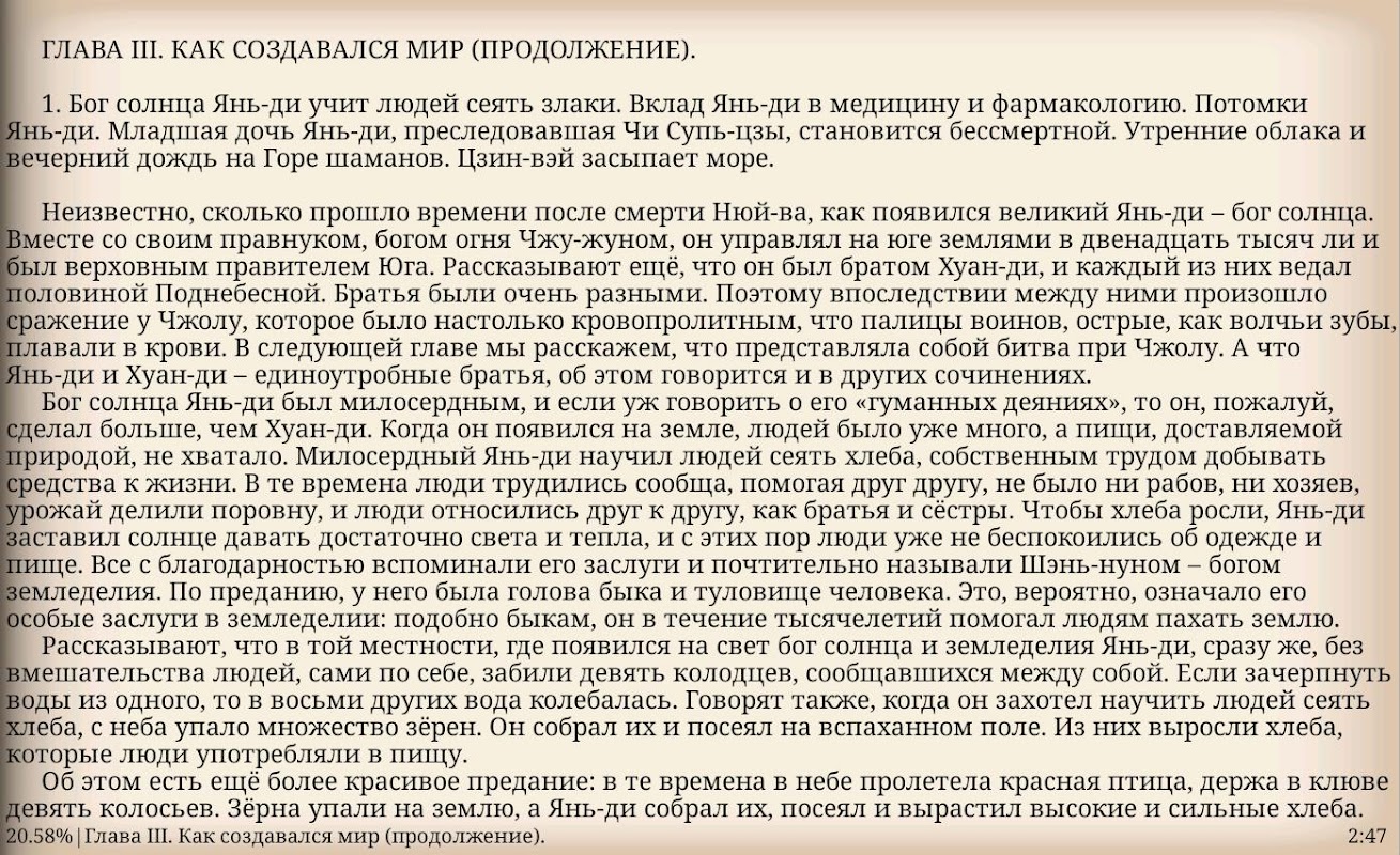 Если вы знакомы с мифами Древней Греции, Скандинавии и Египта, и вас не испугать разными гидрами, минотаврами, троллями и людьми с соколиной или кошачьей головой - тогда добро пожаловать в мир мифологии Древнего Китая! Восьминогие свиньи, девятихвостые лисы, пчёлы, размером со слона, люди без костей и много других диковин... Окунитесь в волшебный мир фантазии Древнего Китая!