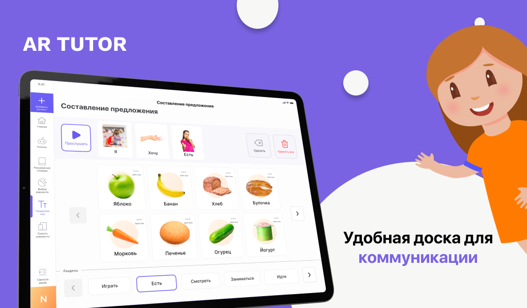 «Составление предложений» – это коммуникативная доска, с помощью которой пользователь может составить предложение и выразить свои мысли и желания без использования слов.